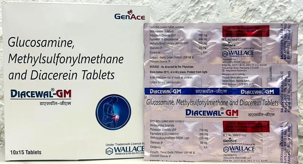 Glucosamine sulphate potassium chloride 750mg, methylsulfonylmethane 250mg and diacerein 50mg Tablet is a combination of three medicines. It is prescribed to treat osteoarthritis. It reduces pain and swelling by reducing inflammation. It also reduces friction in the joints to provide comfort during physical movements.